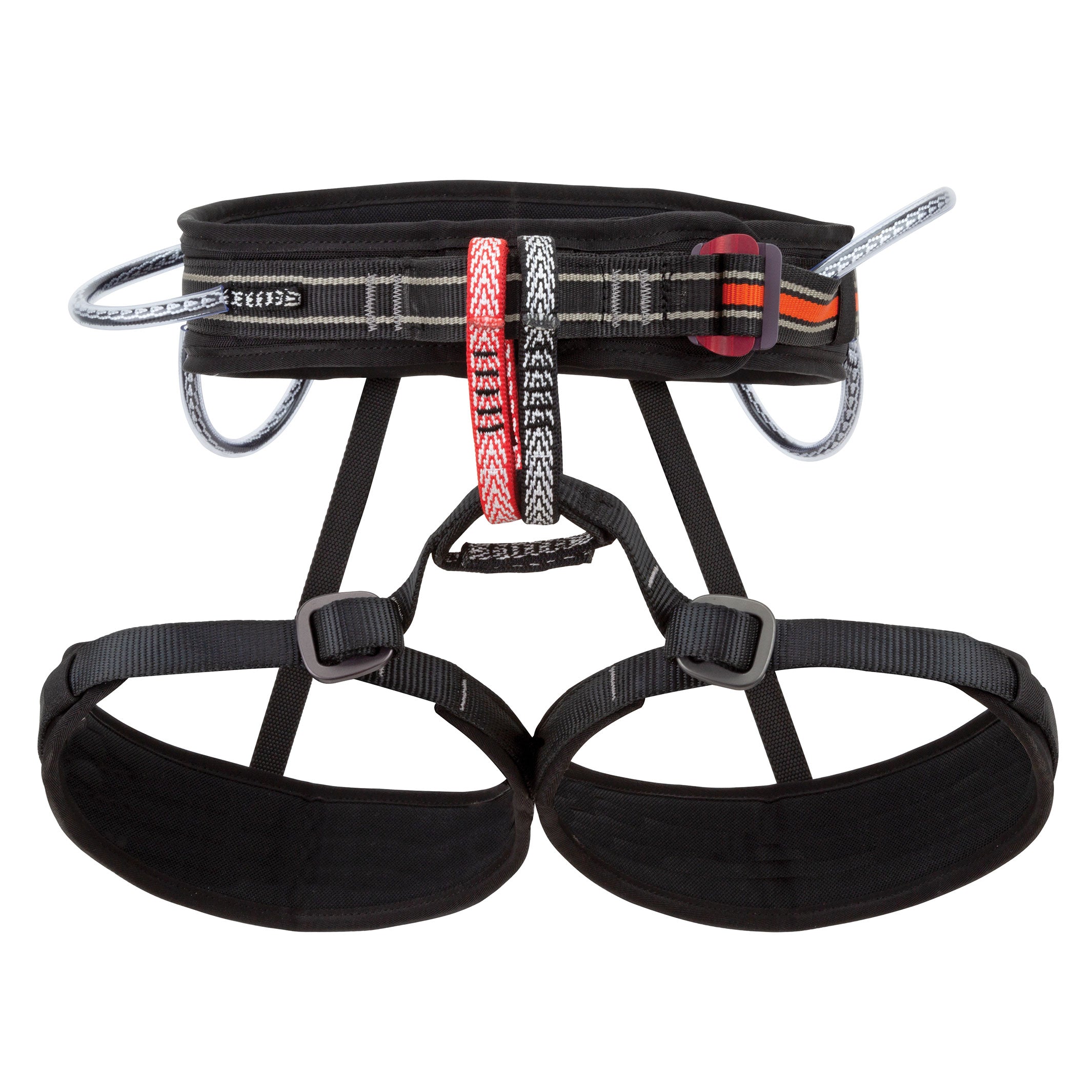 The All Around is a great multi-use harness that features four gear loops (xs has two), a rear haul loop, and reinforced tie in points. Dual belay loops reduce clutter at belay and rappel stations. One simple, patented buckle adjusts the leg loop size and rise (distance between waist and leg loops) for a natural, comfortable fit.