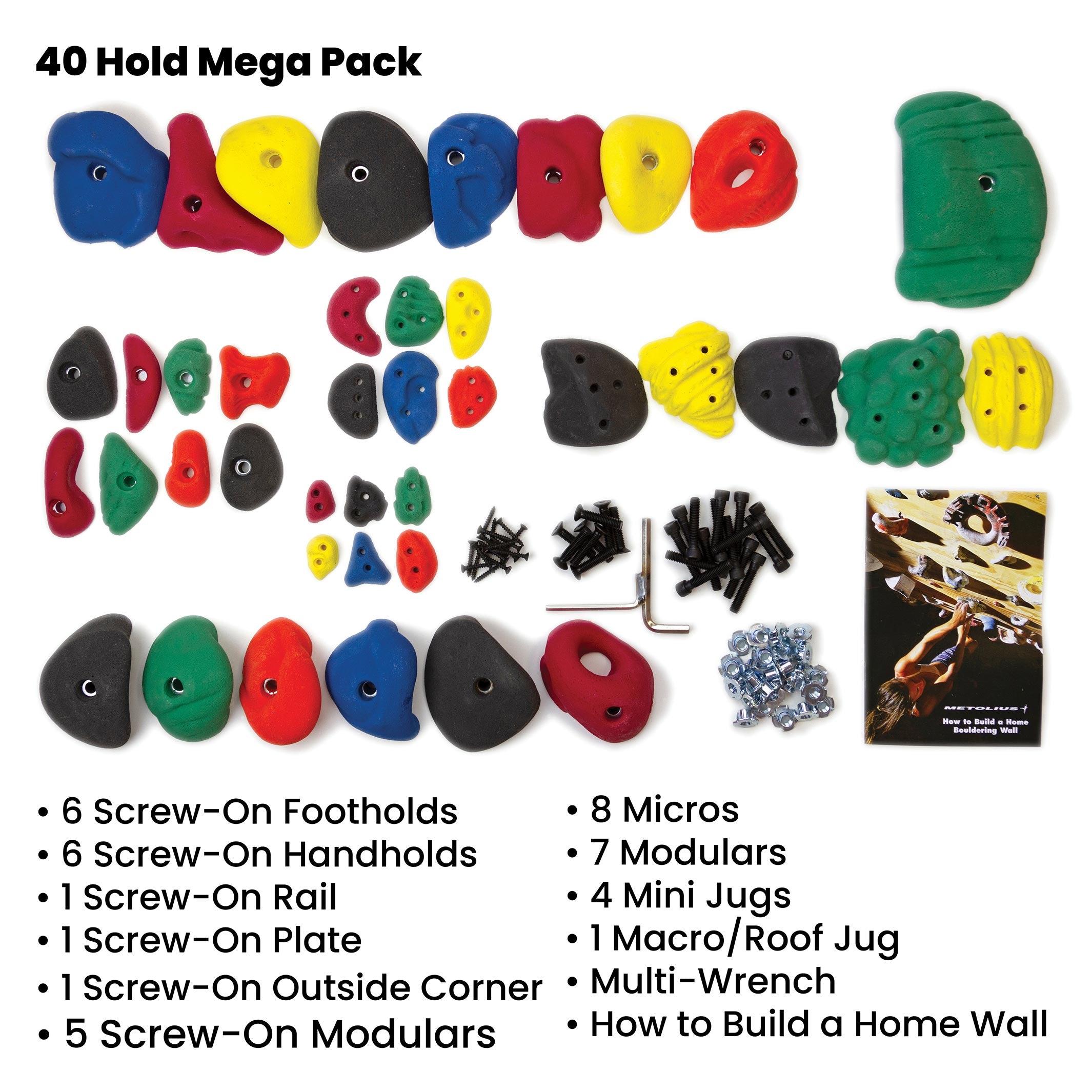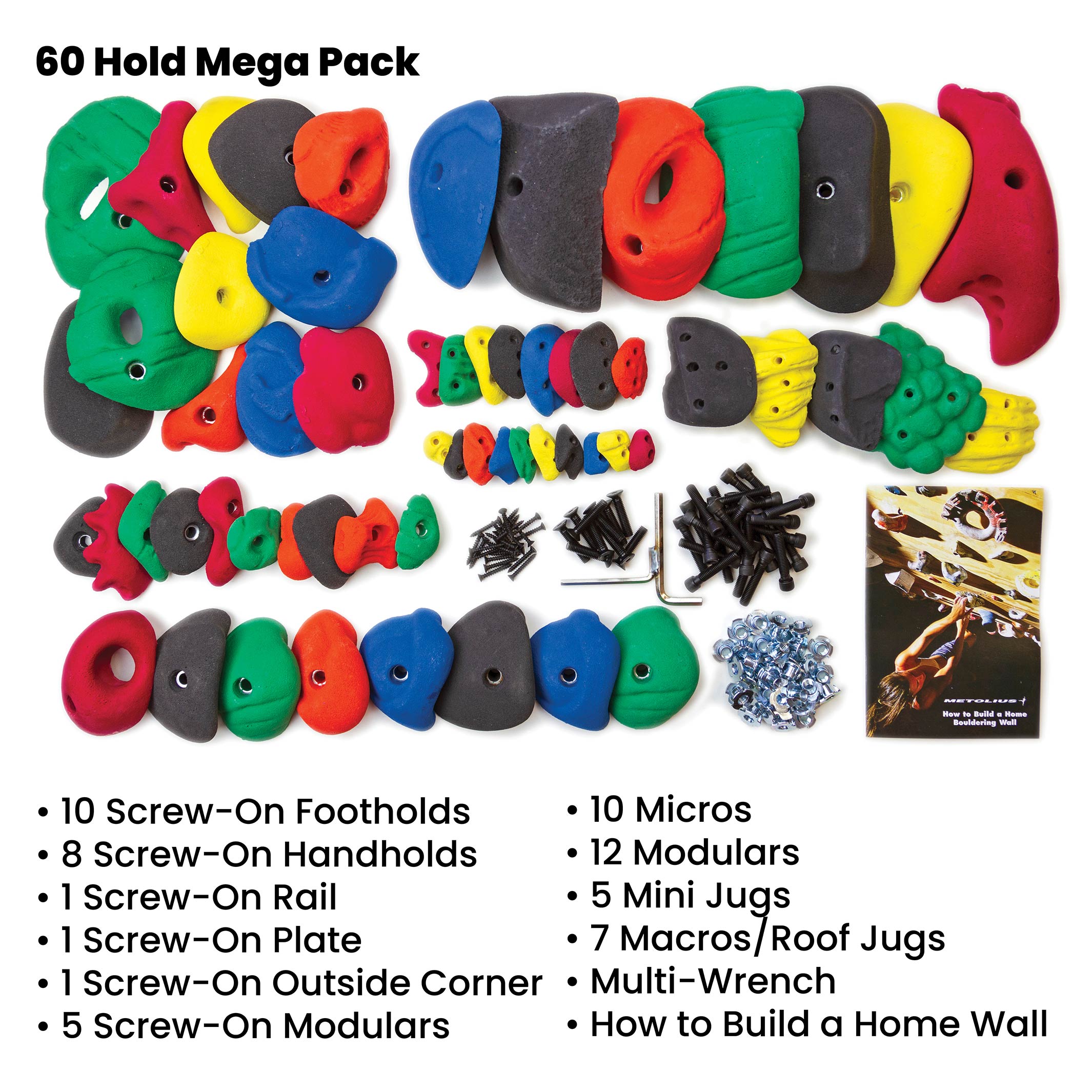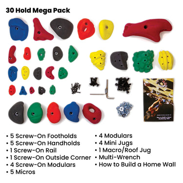 An incredible value, these climbing holds now come in bright, solid colors and are made with strong, polyurethane resin. Each Mega Pack Climbing Holds Set contains a random mix of various sizes of footholds, screw-on hand holds, modular holds, mini-jugs, macro or roof jugs and comes with all the mounting hardware needed. Mega Packs are the ideal starter kit for your home climbing wall.