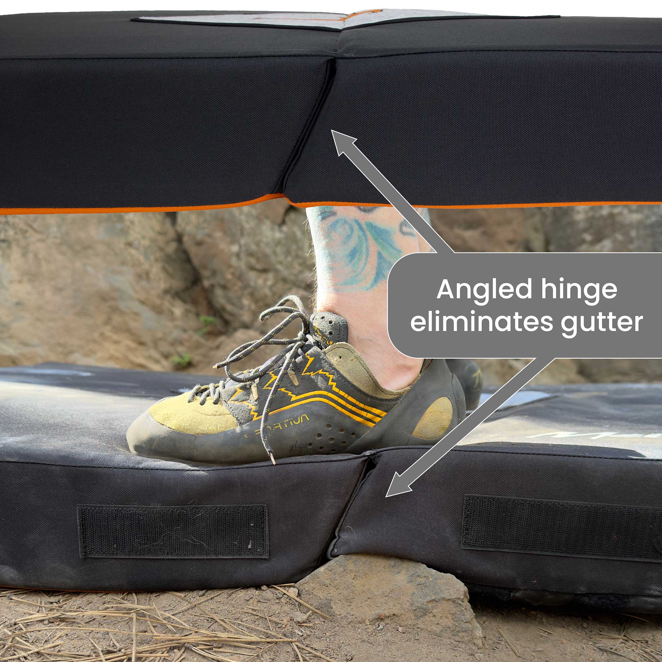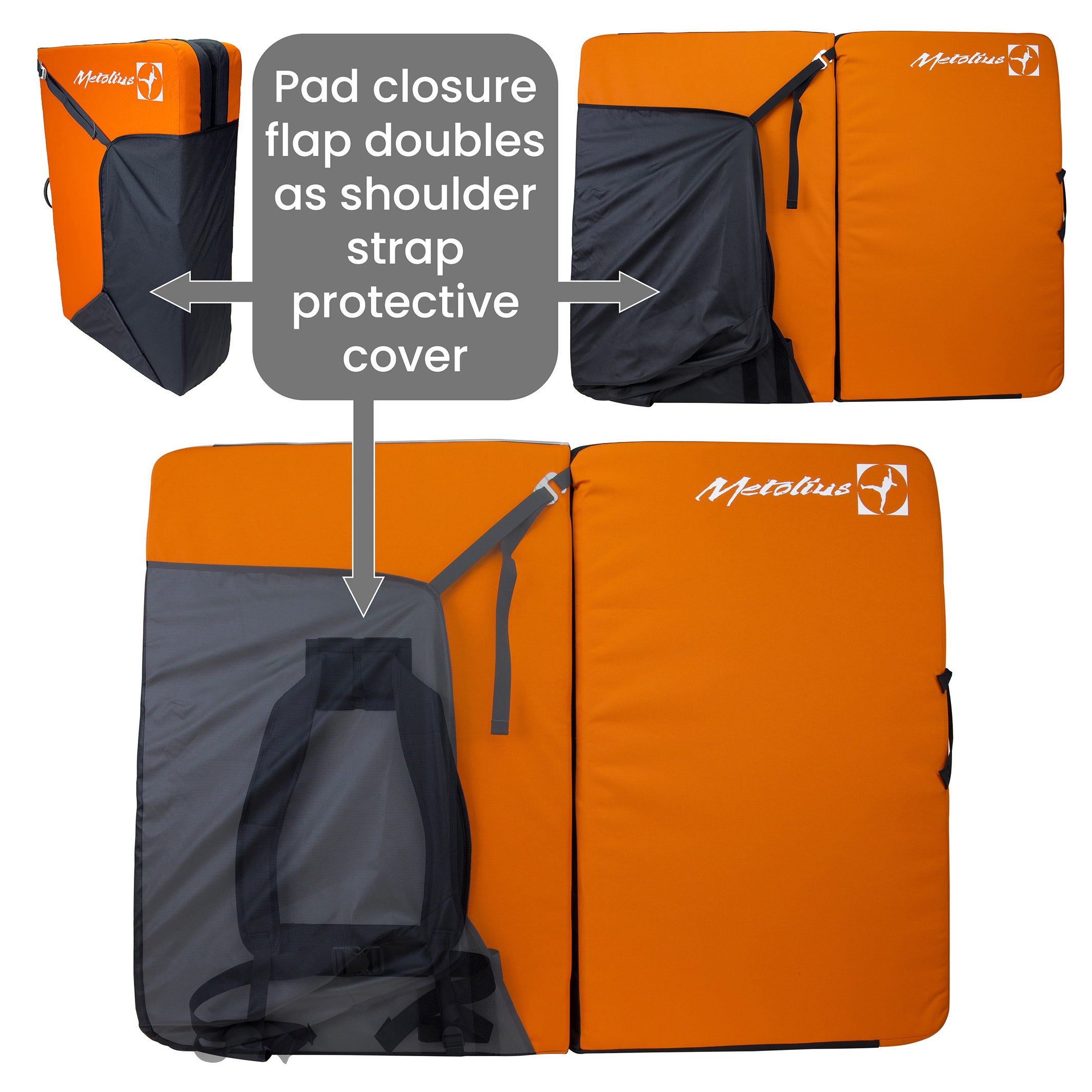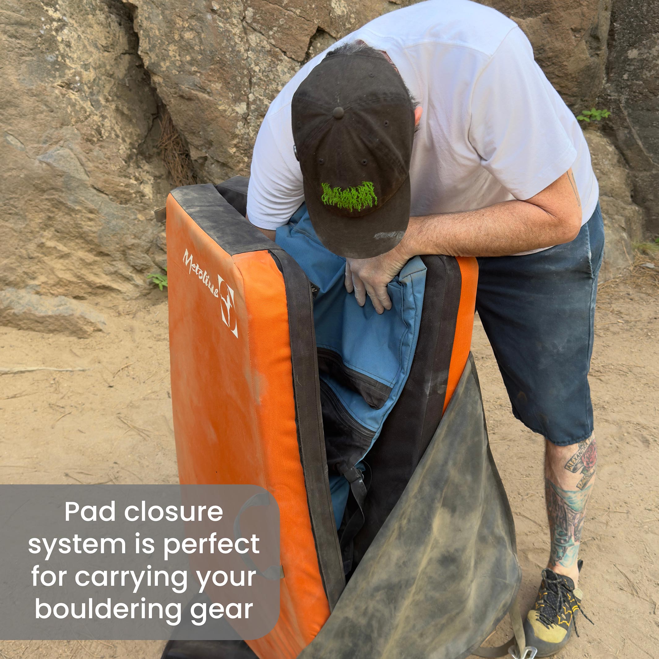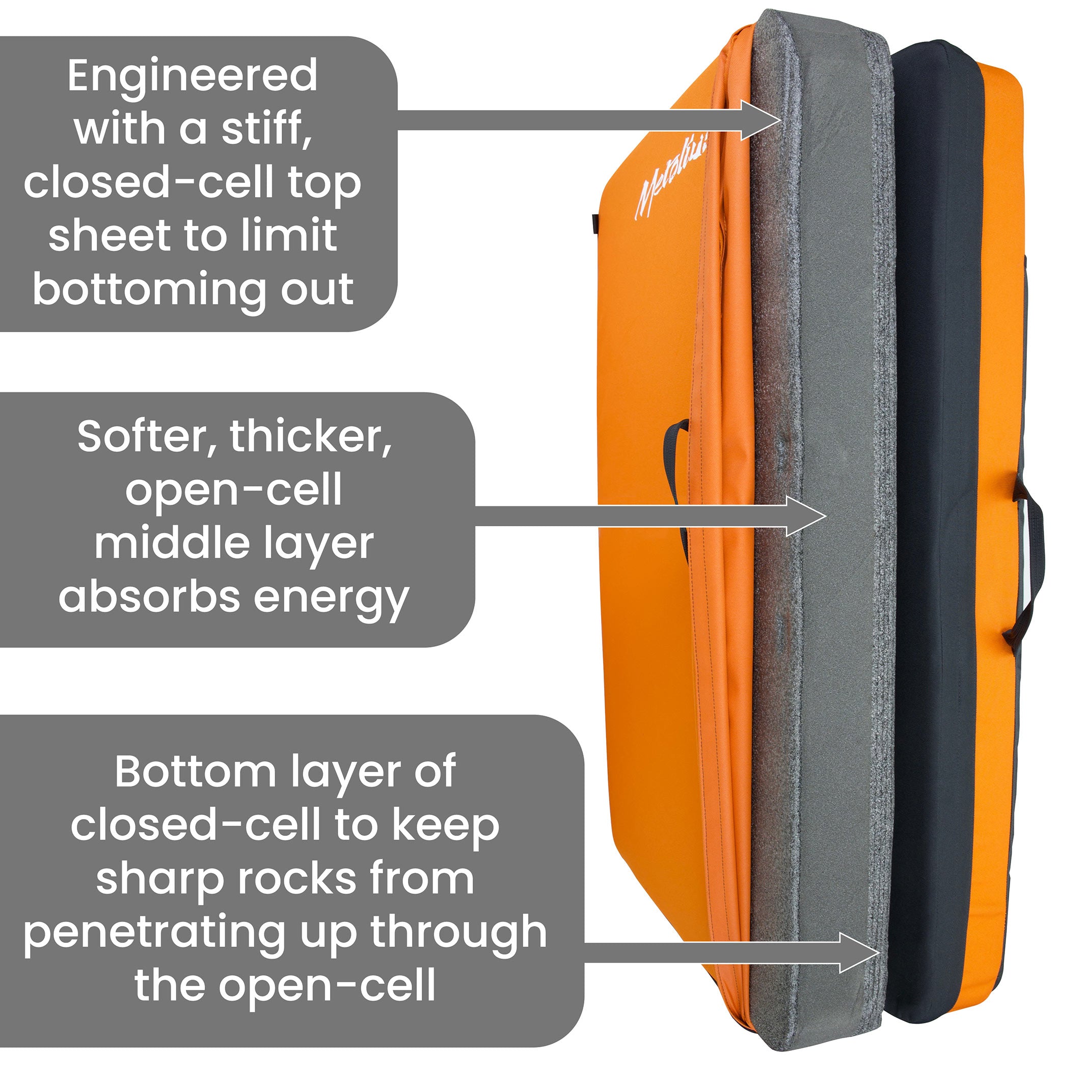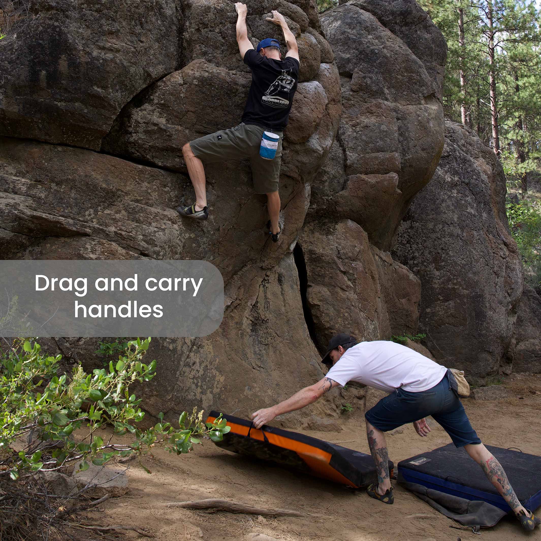 We've made the best selling crash pad in the USA even better! Redesigned flap closure system is easier to load and reverses to cover shoulder straps while bouldering. Two new drag handles make it easier to position while open. This versatile, do-it-all crash pad has burly 900d poly outer fabric that protects your pad from abrasion. Cross-clipper logo rug for cleaning shoes, padded shoulder straps, a waist belt, and suitcase-style carry handles. 4" sandwich foam design for maximum impact absorption, and angled hinges eliminate the gutter. Innovative speed-hook aluminum buckles are guaranteed for life.