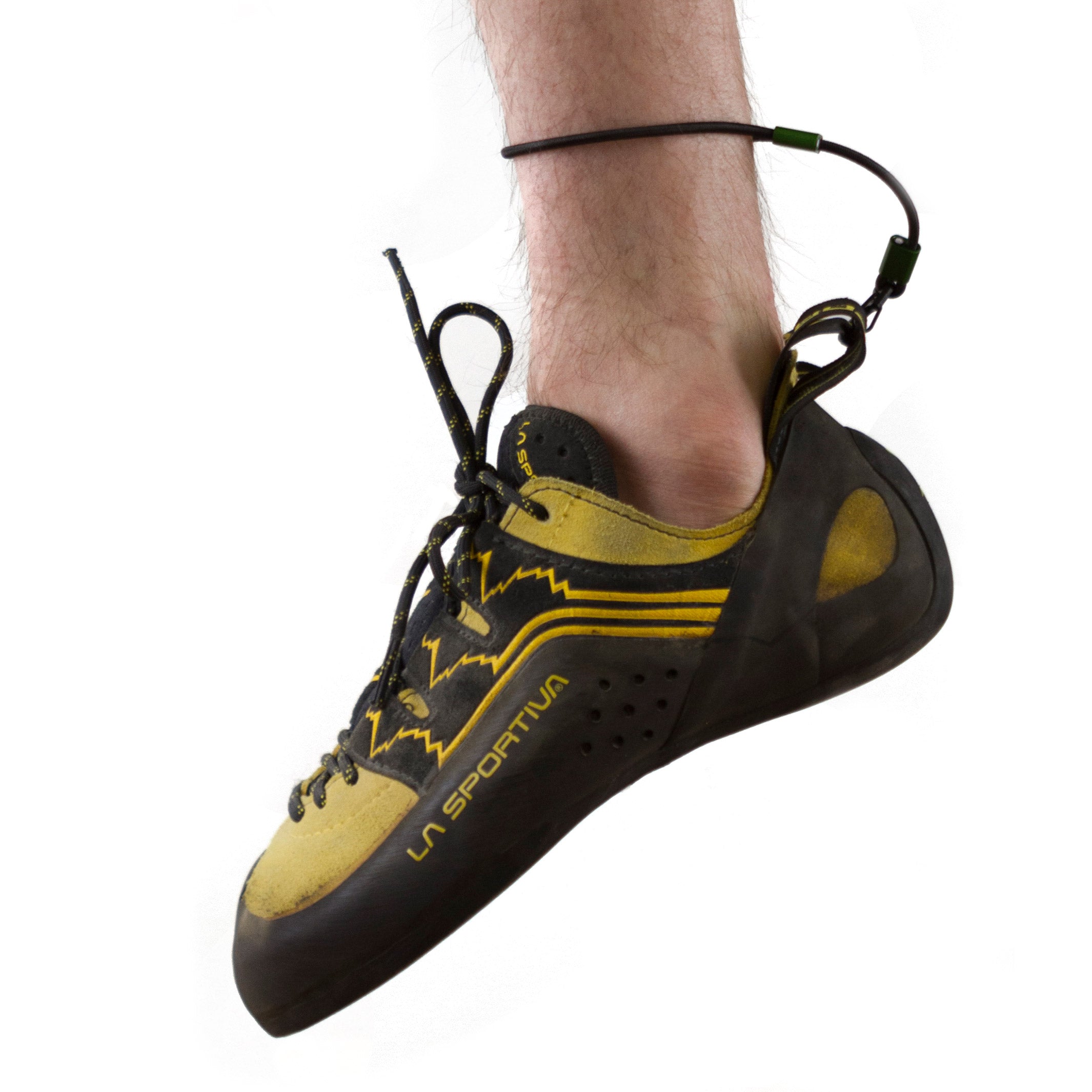 A quick, easy way to remove your shoes on multi pitch routes. Hang Dogs are light, low profile and easy to use. Simply slip your foot into the loop and cinch down, then clip the keeper to the loop on the back of your shoes.