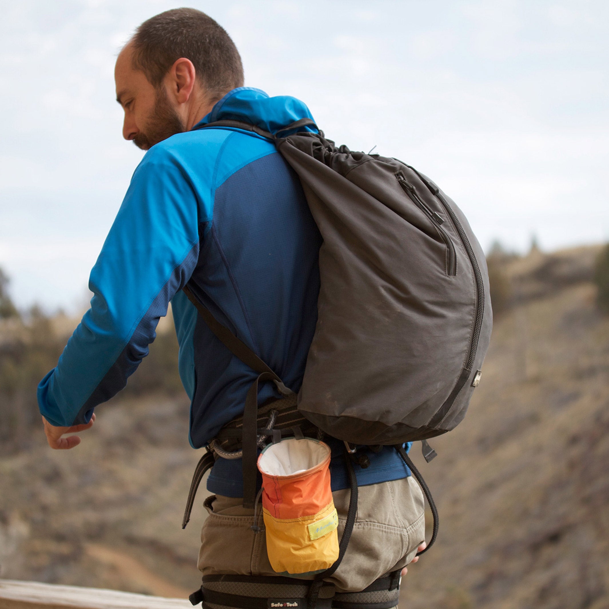 An innovative, pack-style rope bag with a center zipper for easy access to your rope and climbing gear. The Speedster is big enough for 70 m cords with heaps of room for shoes, harness, draws, chalk bag. It also has a small zippered accessory pocket.